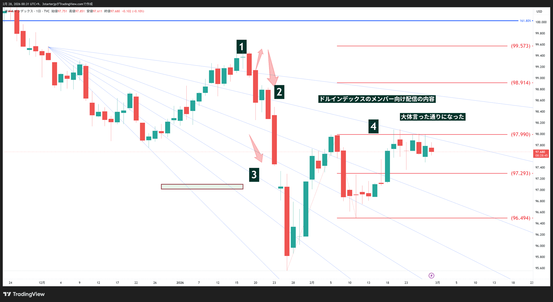 メンバーサイトでドルインデックスが1番のところから下落する前に、質問があったので答えた値動き想定です。3まで下落したら4へ戻るという話。2で一部を利確するイメージでした。