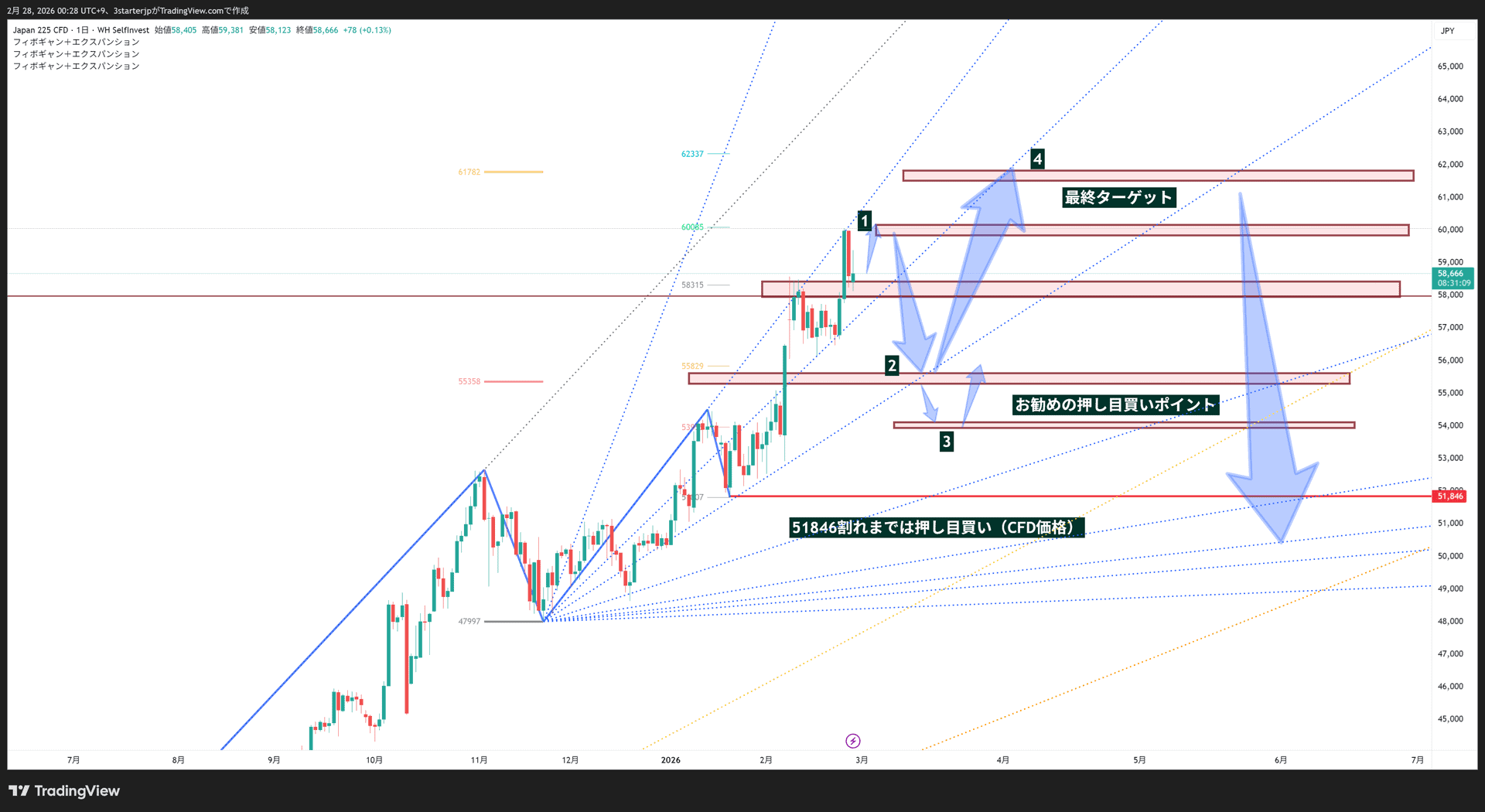 私は「55000買い→59000円利食い」とメンバーサイトや各種SNSで言っていましたが、大台行きましたね。私は59900台で売っています。