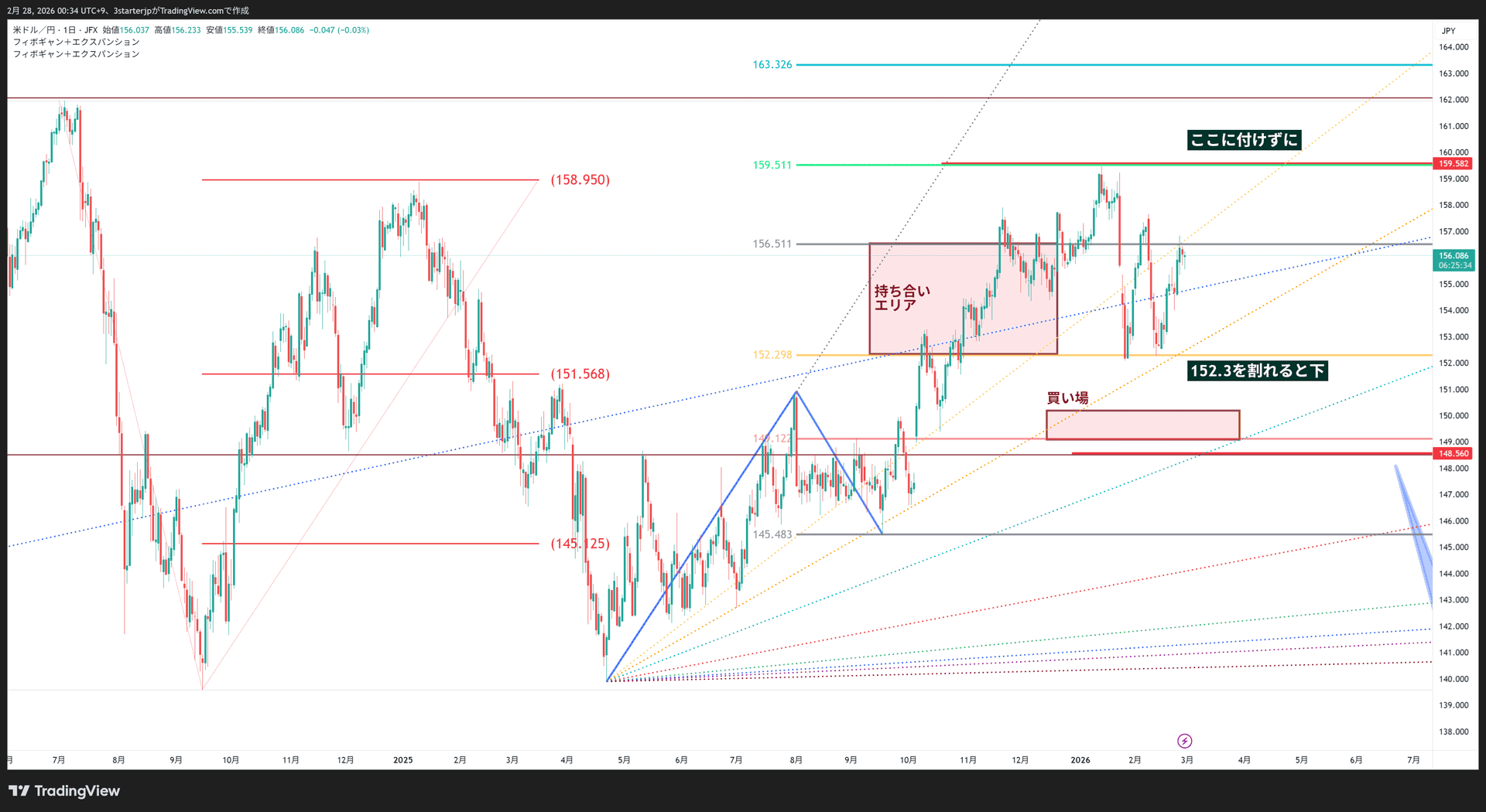 152.3を割れると150割れもあり得るので強いサポートになっている。154.3は今年一番重要な値位置の一つ。年の仕込みだから。