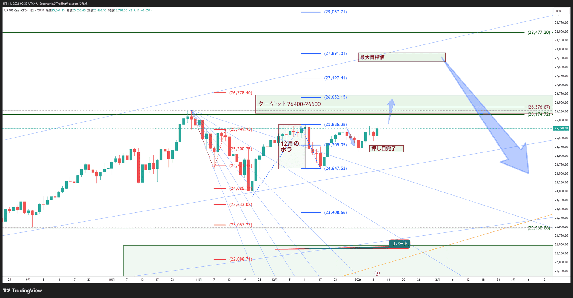 そんなナスダックのターゲットは上のチャートに書いた通りです。
