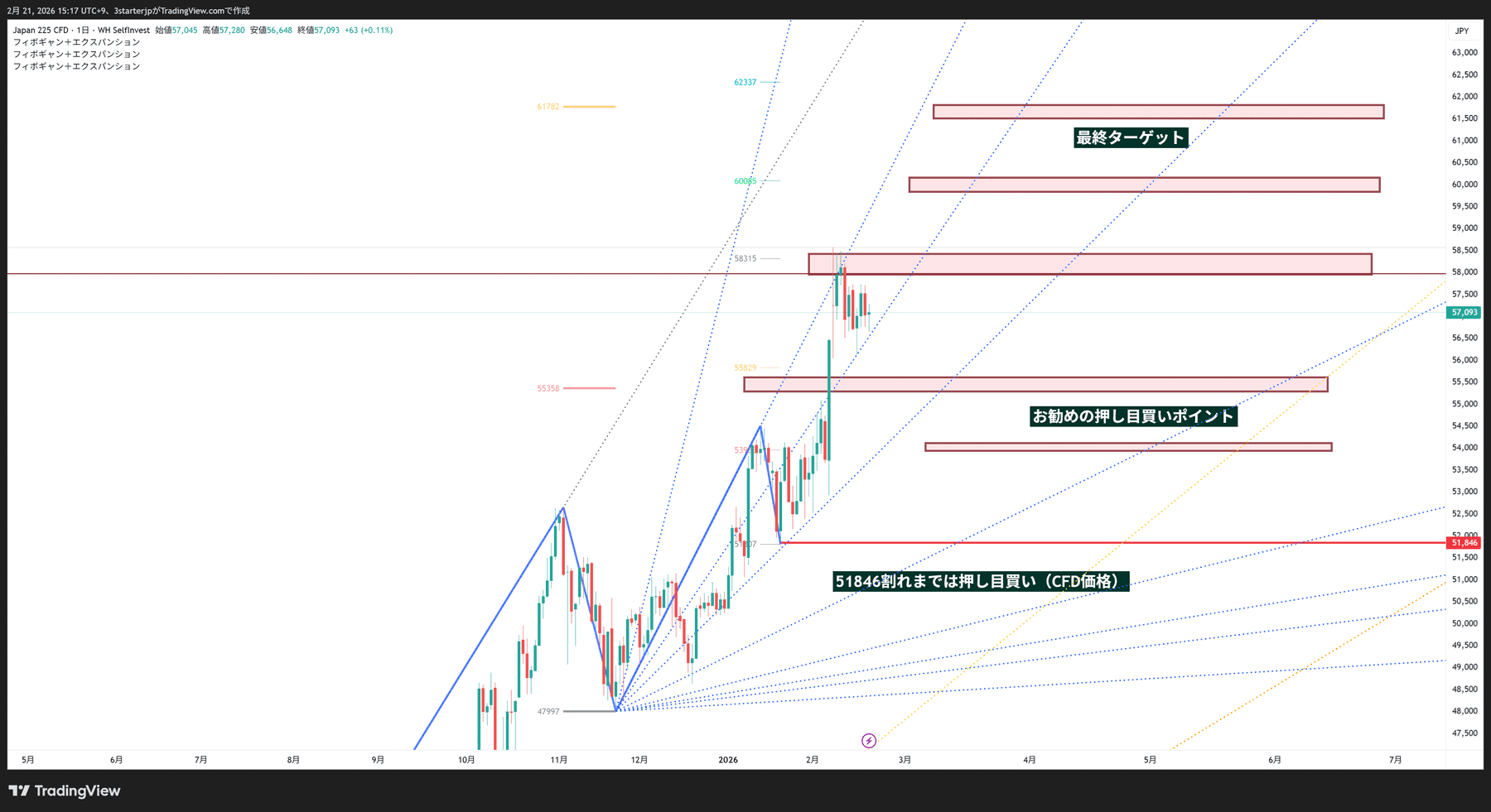 • ただし長期の太いラインが57975円にあるので、これを越えたら6000円そして61782円があるけど、中期ラインから見れば55358円に押し目がないと厳しいでしょうと。