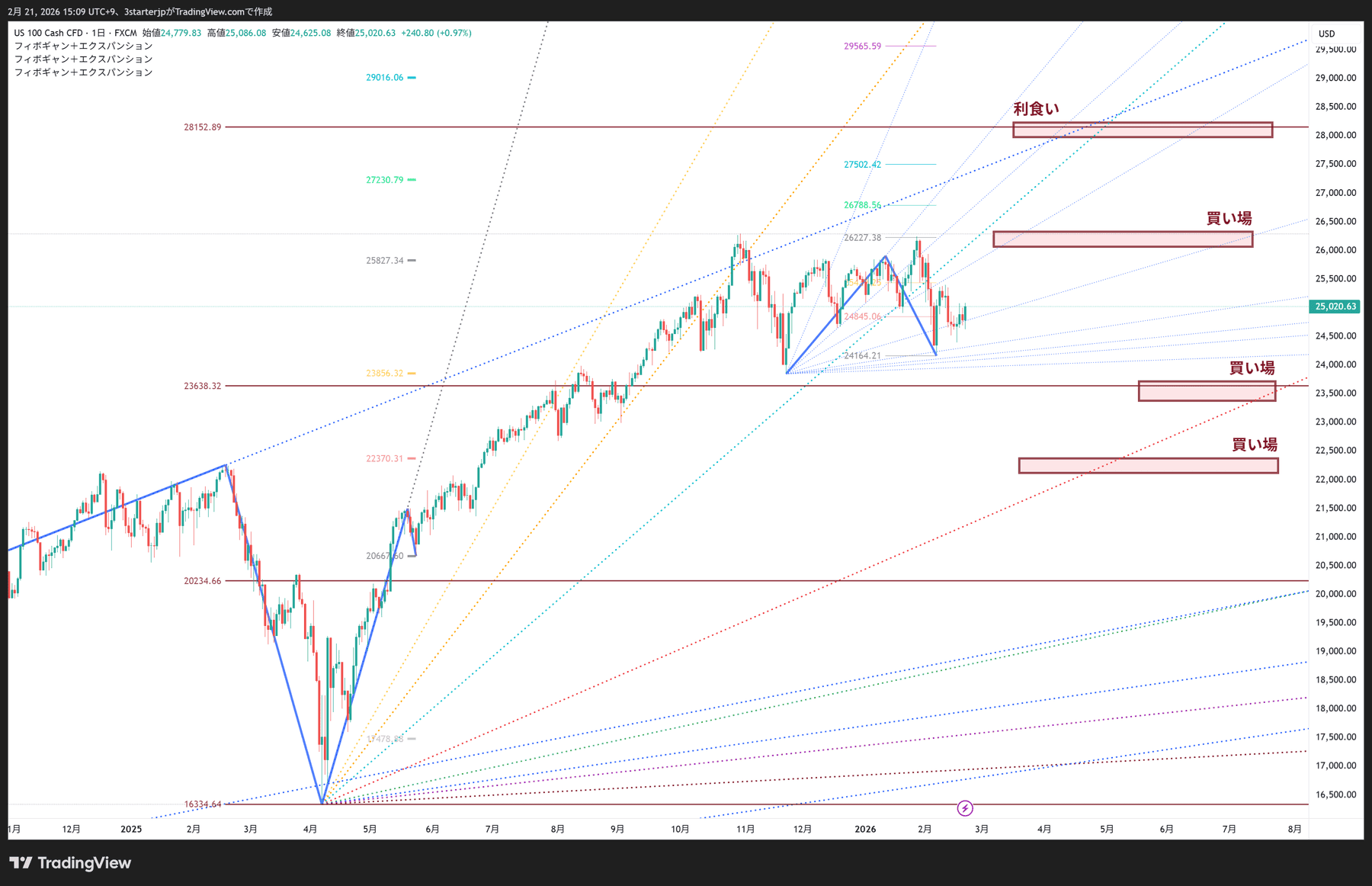 こちらは最大で22370ポイントまで行けるようです。ギャンファンの1×1もあるので5月6月くらいだと一番良いけど、少なくとも3月入るまで持ち合いじゃないかなーと何となく思いますね。なぜなら、今行くと本格的に下落しちゃうので粘っている。そうなると、終値を上に残したまま押し目になるなら月をまたぐ必要があるからです。この後下落する予定なら今下落するでしょう。しかし、押し目なら粘るんじゃないかな。