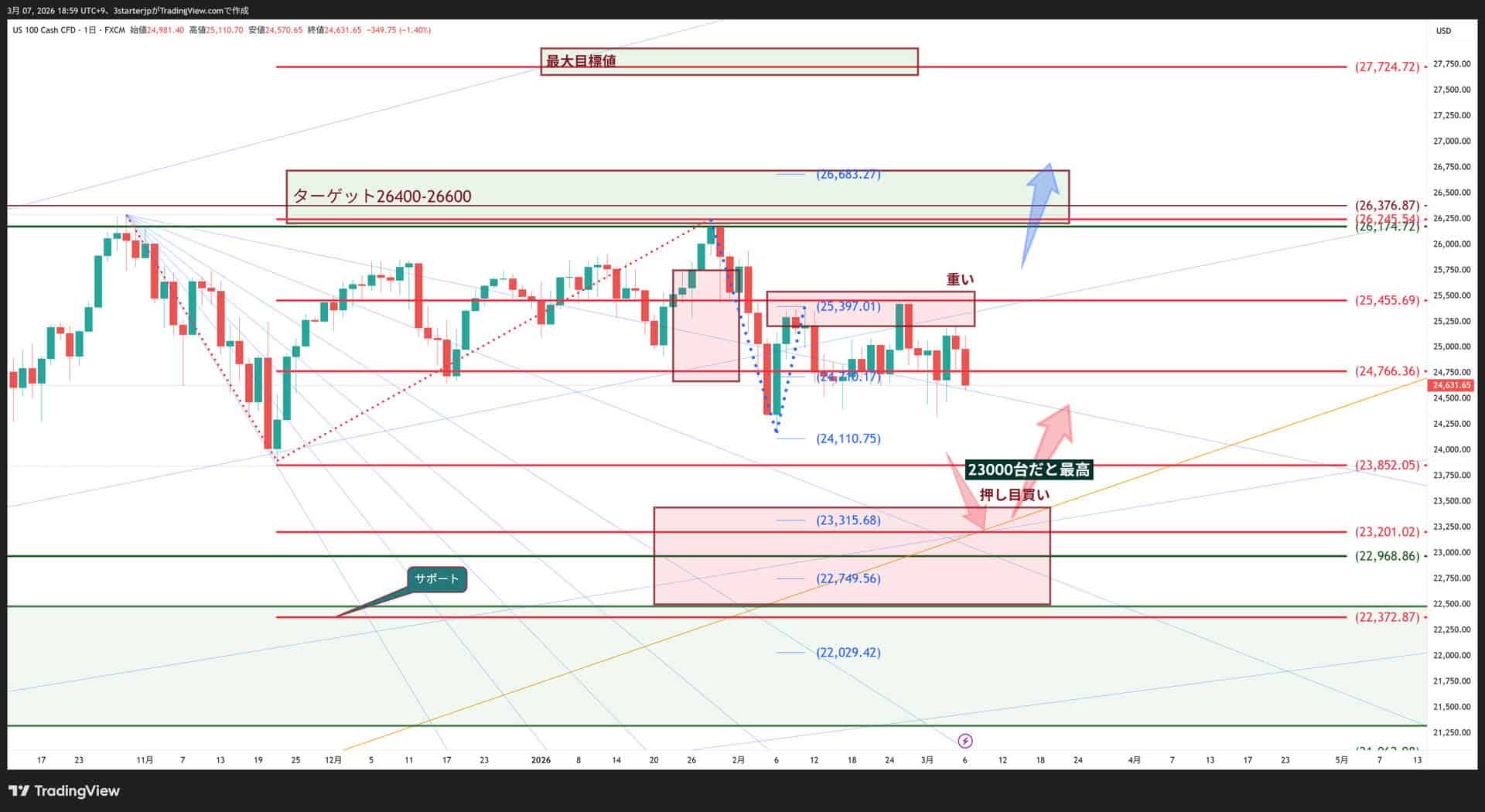今は当然売りで、週明けはもしかすると下に飛ぶかもしれません。土日の間に戦争が激化したり、またはベッセント財務長官が今週中に関税15%がどうこうという話もしていましたね。なので、買っている人はいないと思いますが危ないです。