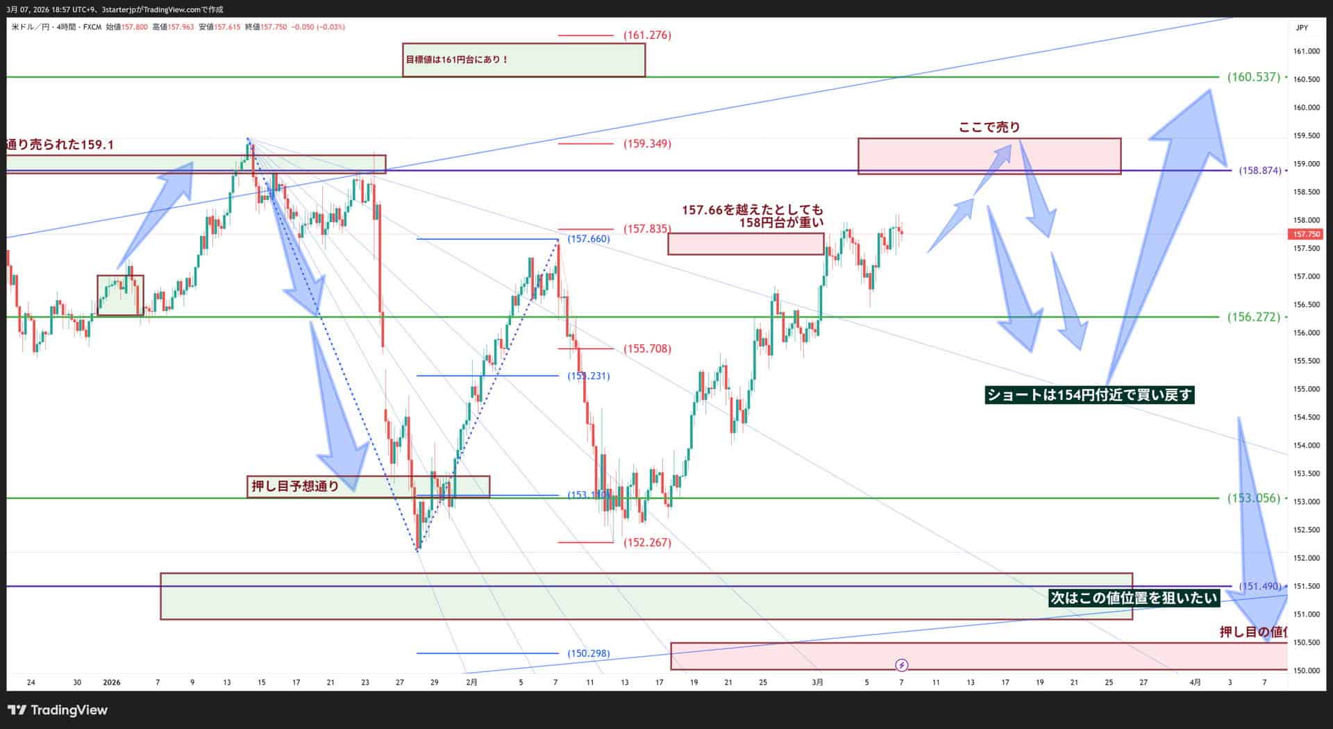 最近ではXなどで「158.1損切りで売る」という話をしていて、何とギリギリ付けずに今います(笑)。