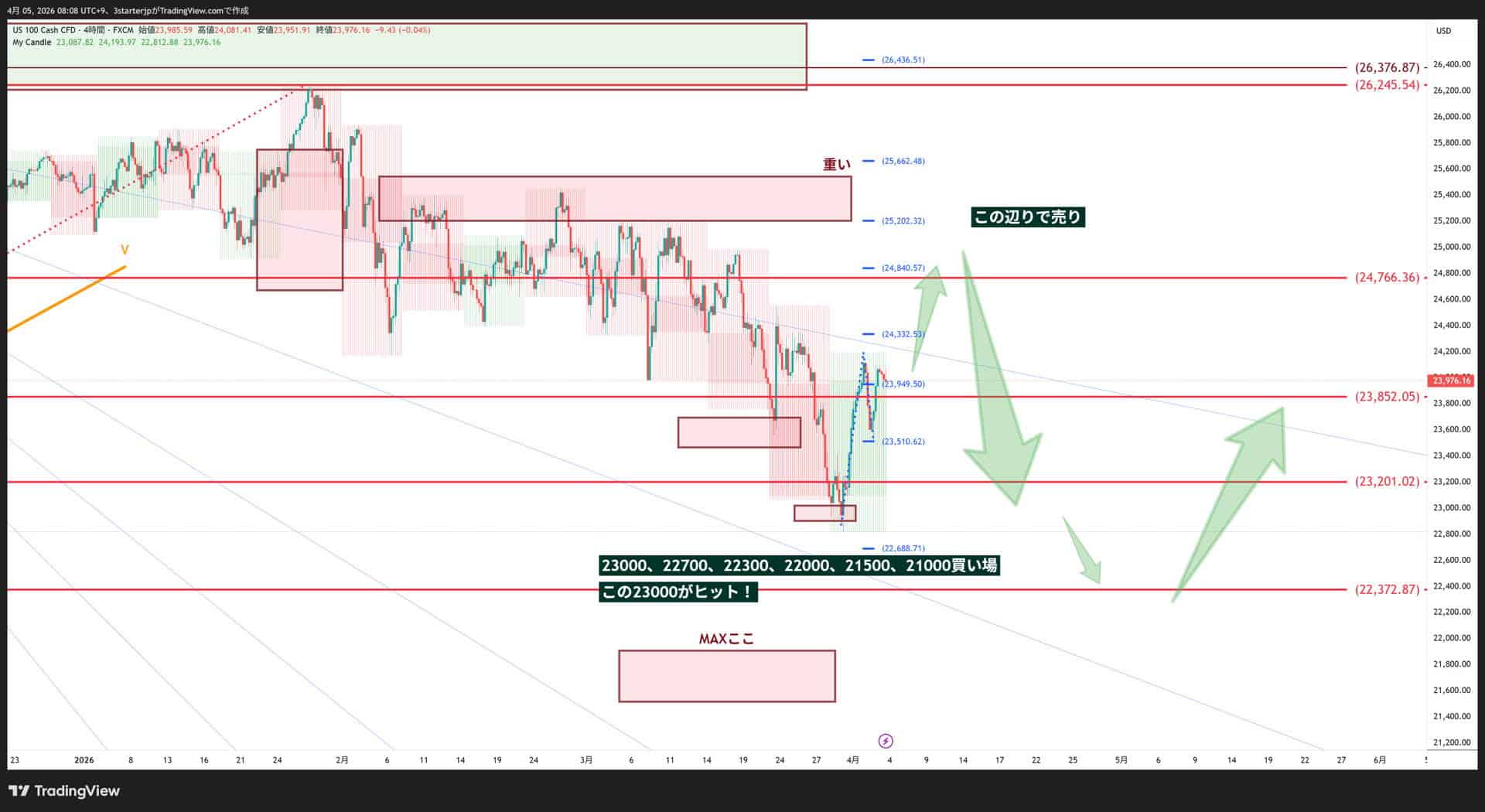 次は22700、22300、22000、21500、21000辺りへ目掛けて売って行きましょう。